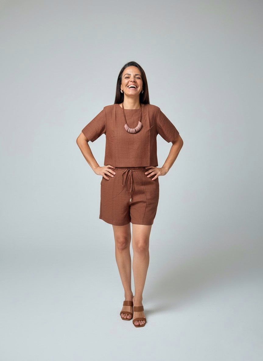 - Tecido Texturizado: Possui uma textura delicada e levemente irregular (tipo crinkled ou amassadinho), que confere profundidade à cor e dispensa o uso constante de ferro de passar.